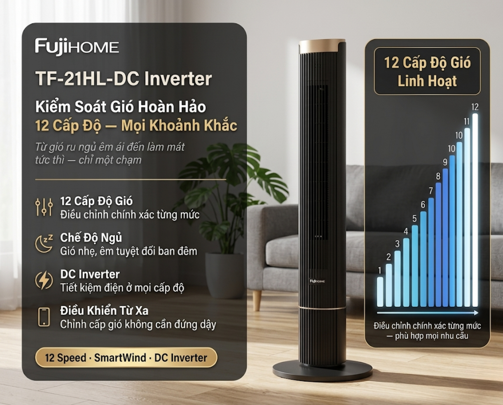 Trong kỷ nguyên công nghệ 2026, tiêu chuẩn của một chiếc quạt tháp hiện đại không còn chỉ nằm ở sức gió mạnh, mà ở khả năng "thấu hiểu" người dùng thông qua việc tùy biến tinh tế. Hệ sinh thái quạt tháp Fujihome SmartWind, với hai đại diện xuất sắc là TF-21L-DC và TF-21HL-DC, đã thiết lập một chuẩn mực mới về sự linh hoạt với dải 12 cấp độ gió. Đây không chỉ là một thông số kỹ thuật, mà là chìa khóa để mỗi thành viên trong gia đình tự tạo ra "vùng khí hậu" hoàn hảo cho riêng mình.