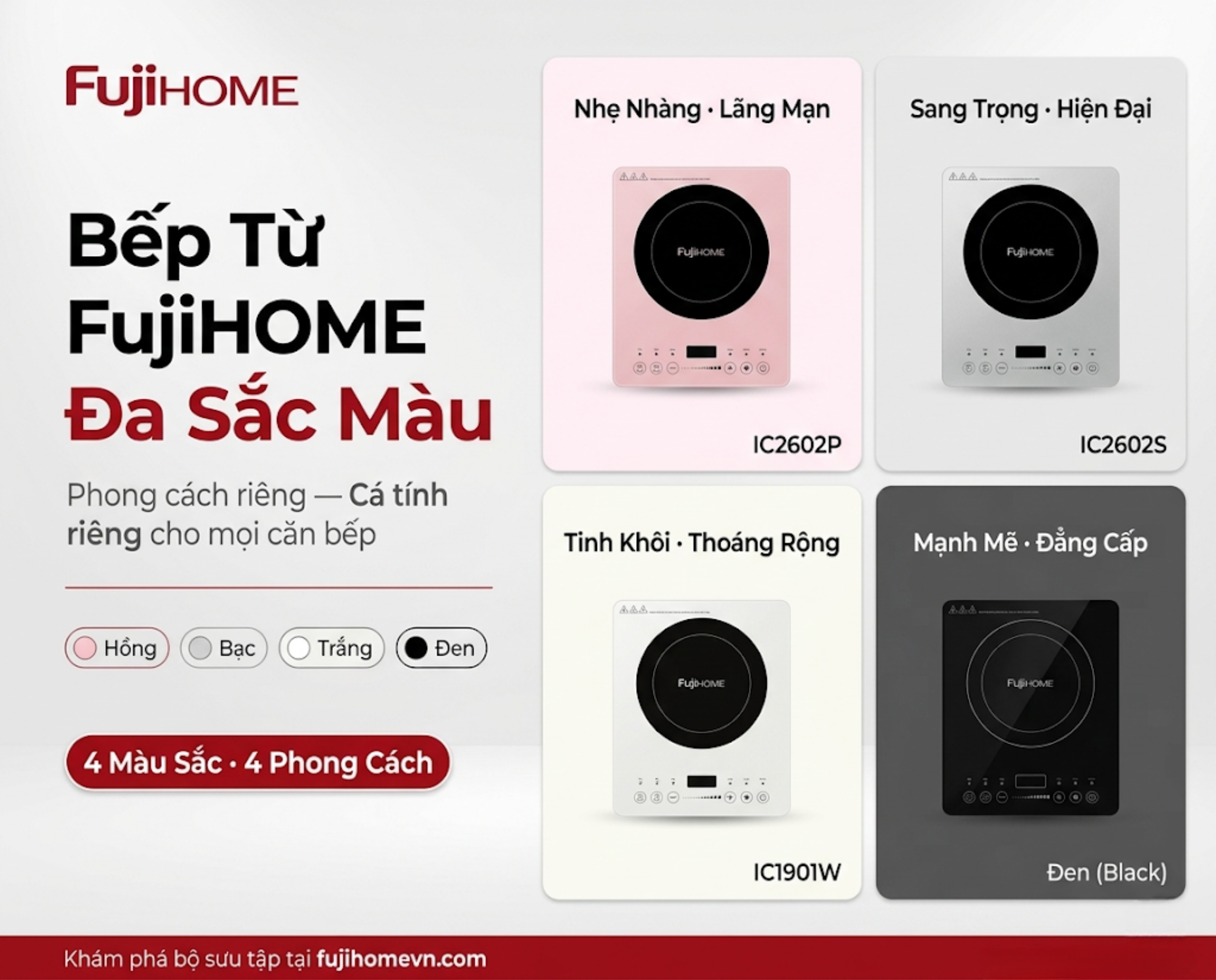 Fujihome mang đến một bộ sưu tập bếp từ Fujihome phong phú, không chỉ về tính năng mà còn về màu sắc, đáp ứng mọi sở thích và phong cách thiết kế nội thất của gia đình Việt: