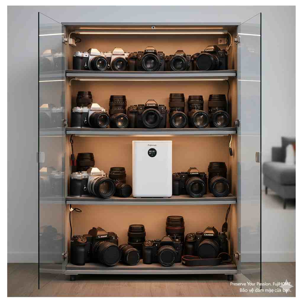 Thay vì đầu tư những chiếc tủ chống ẩm chuyên dụng đắt đỏ (có giá từ 3 - 10 triệu đồng), nhiều Creator chuyên nghiệp hiện nay đang lựa chọn giải pháp DIY (Tự làm) thông minh hơn: Kết hợp tủ kính/tủ điện tử với máy hút ẩm mini.