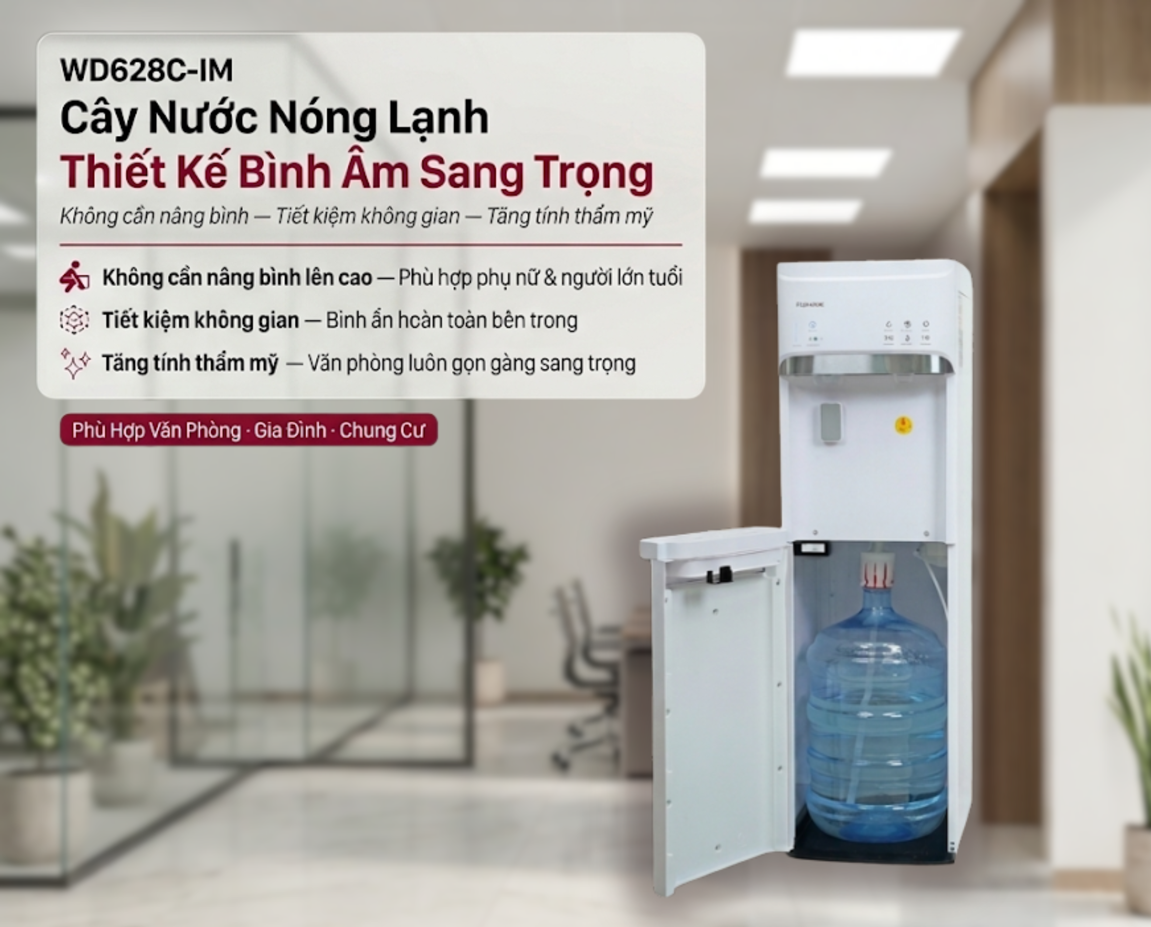 Cây nước thông minh Fujihome WD628C-IM thiết kế bình âm sang trọng đặt trong không gian văn phòng hiện đại.