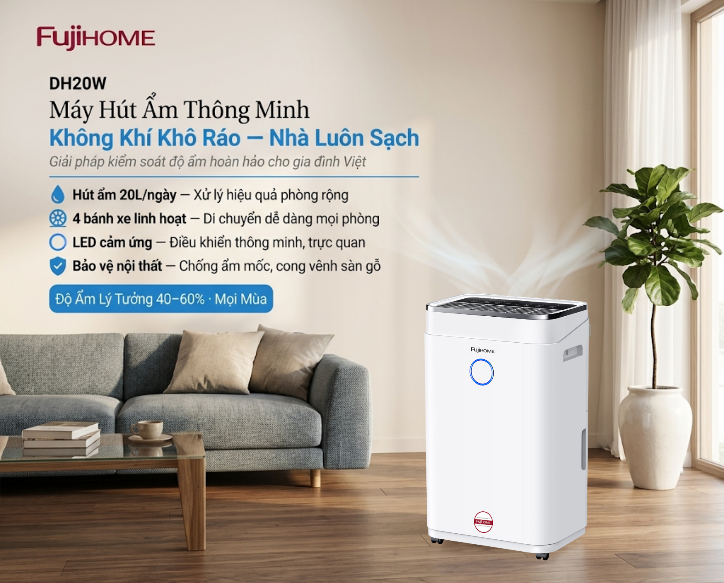Máy hút ẩm Fujihome DH20W thiết kế sang trọng đặt trong không gian phòng khách hiện đại