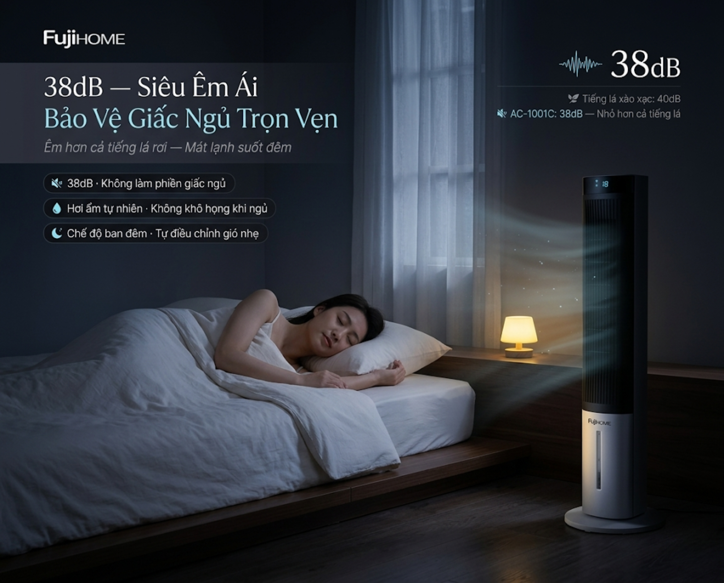Quạt tháp Fujihome AC-1001C hoạt động siêu êm ái chỉ với 38dB, bảo vệ giấc ngủ.