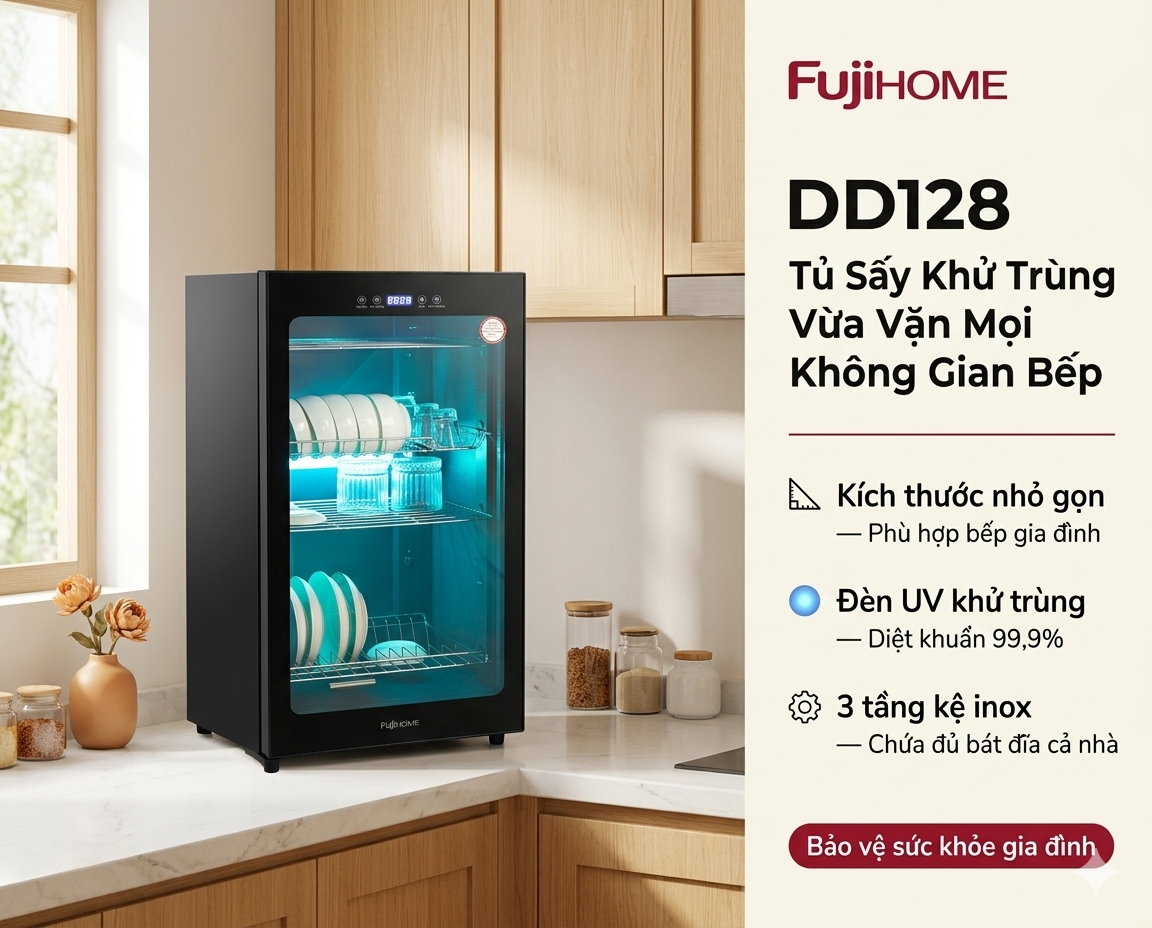 Fujihome DD128 không chỉ là một chiếc tủ sấy chén bát thông thường, mà là một trung tâm quản lý vệ sinh dụng cụ ăn uống hiện đại. Với sự kết hợp hoàn hảo giữa dung tích lớn 128L, hiệu suất sấy khô vượt trội và công nghệ tiệt trùng kép UV + Ozone, DD128 xứng đáng là lựa chọn hàng đầu cho các gia đình Việt Nam đang tìm kiếm một giải pháp bền vững, an toàn và tiện nghi cho cuộc sống hiện đại.