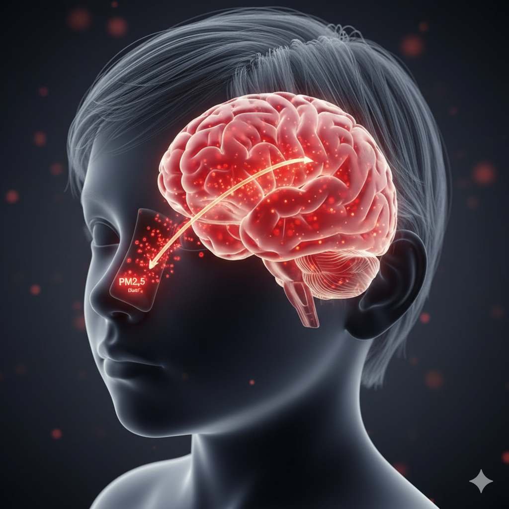 Khi trẻ hít thở, các hạt siêu nhỏ PM2.5 không chỉ dừng lại ở phổi. Chúng đi thẳng qua niêm mạc mũi, len lỏi dọc theo dây thần kinh khứu giác. Tại đây, chúng “bypass” (vượt qua) hoàn toàn hàng rào máu-nào để đổ bộ trực tiếp vào chất não. Não bộ – cơ quan được bảo vệ nghiêm ngặt nhất – bị đột nhập dễ dàng như thể không có cửa khóa.