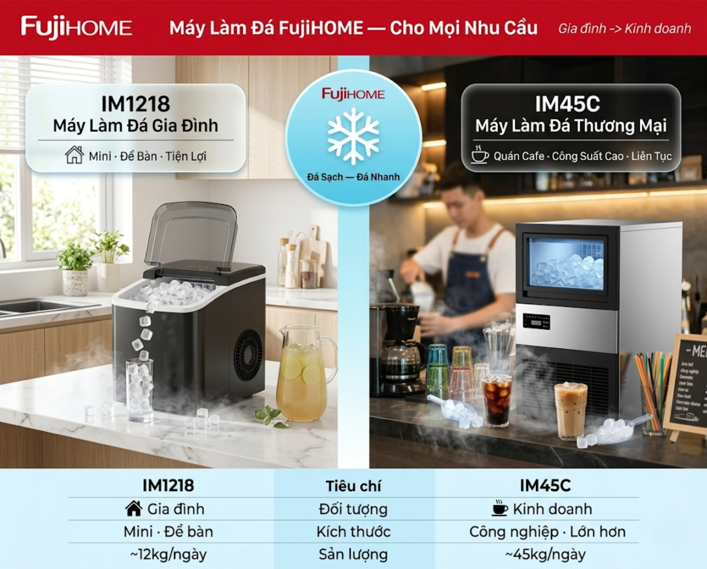 Nhận thấy xu hướng tất yếu này, Fujihome đã mang đến thị trường hai dòng máy làm đá chuyên biệt, đáp ứng hoàn hảo từ nhu cầu sử dụng cá nhân, gia đình cho đến các mô hình kinh doanh vừa và nhỏ. Bài viết này sẽ phân tích chuyên sâu và so sánh trực tiếp hai phân khúc sản phẩm nổi bật: Máy mini IM1218 và Dòng máy thương mại IM45C / IM70C, giúp bạn đưa ra quyết định đầu tư tối ưu nhất.