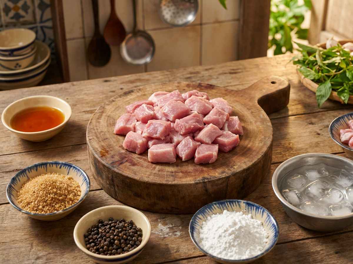 - Bước 1: Sơ chế: Thịt rửa sạch, thái miếng nhỏ. Ướp thịt với nước mắm, đường, tiêu trong khoảng 30 phút cho ngấm gia vị.