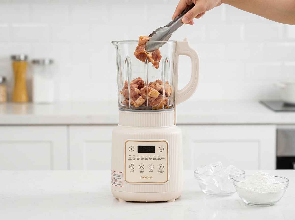 - Bước 2: Xay thịt: Cho thịt đã ướp vào cối máy làm sữa hạt FujiHOME SM01A. Thêm nước đá lạnh và bột năng vào cùng.