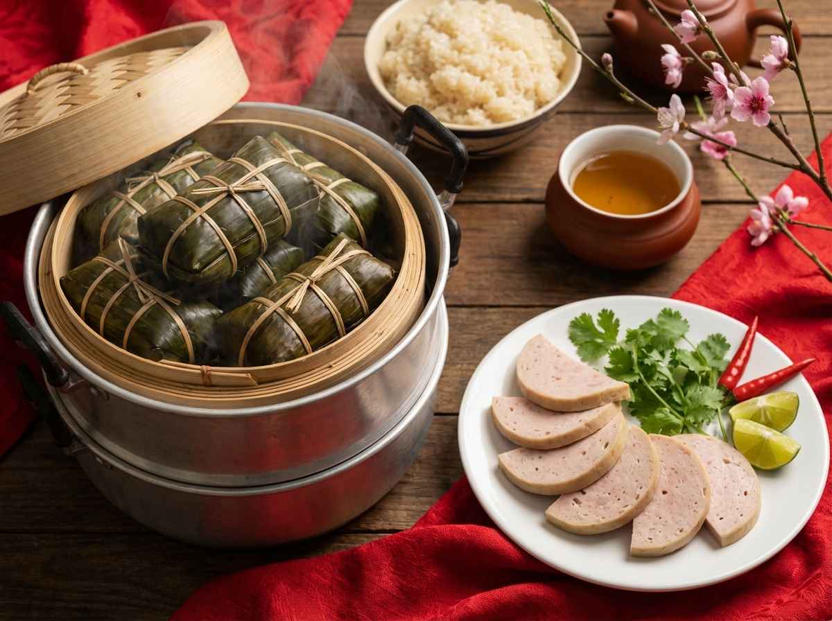 - Bước 5: Hấp giò: Gói giò vào lá chuối hoặc màng bọc thực phẩm chuyên dụng. Hấp trong khoảng 45–60 phút tùy độ dày của cây giò.