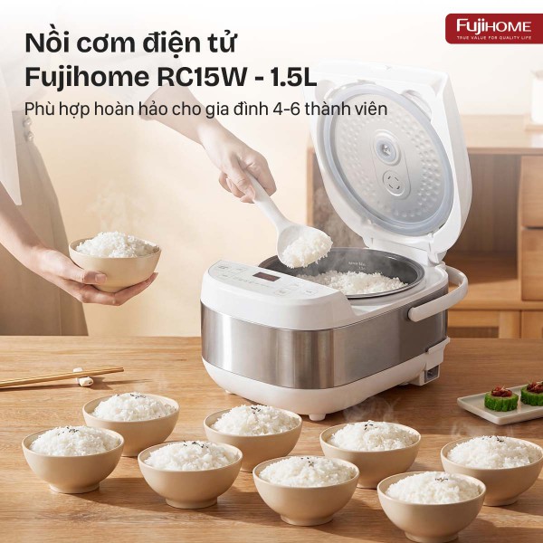 Giới thiệu nồi cơm điện Fujihome RC15W Nồi cơm điện RC15W dung tích thực 1.5L* là mẫu nồi đa năng thế hệ mới, được thiết kế hiện đại, hiệu suất mạnh mẽ và chăm chút từng hạt cơm.
