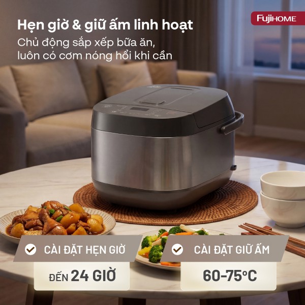 Bữa tối có thể được chuẩn bị ngay từ sớm với chức năng hẹn giờ thông minh lên đến 24 tiếng. Tự chủ và tiết kiệm thời gian nấu ăn, thảnh thơi làm việc khác với Fujihome RC18G.