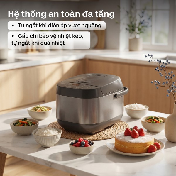 Cầu chì bảo vệ nhiệt kép: Trang bị hai tầng bảo vệ nhiệt; khi nhiệt độ vượt mức an toàn, cầu chì sẽ ngắt mạch tức thời, chống quá nhiệt và nâng cao độ bền cho mâm nhiệt cũng như linh kiện bên trong.