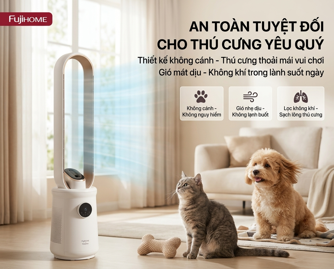 Quạt không cánh Fujihome BF15 là lựa chọn an toàn nhất cho các gia đình nuôi thú cưng.
