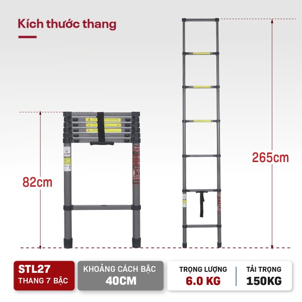 Kích thước khi mở thang: 44.7 × 5.2 × 265 cm