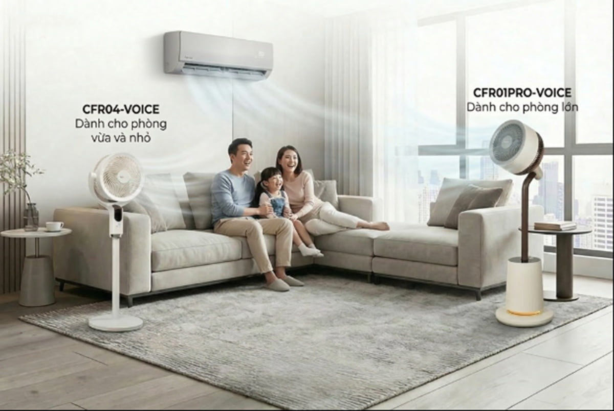 CFR04-VOICE cho phòng vừa và nhỏ: gọn nhẹ, 8 cấp tốc độ, dễ di chuyển giữa các phòng, tích hợp khay sáp thơm - bật lên vừa mát vừa thơm phòng tự nhiên.