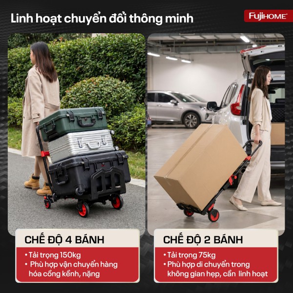 Với thiết kế 2 trong 1 linh hoạt, FTM-150 có thể chuyển đổi giữa xe đẩy 4 bánh và xe đẩy 2 bánh, đáp ứng đa dạng nhu cầu sử dụng từ vận chuyển hàng hóa nặng đến di chuyển linh hoạt trong không gian hẹp.